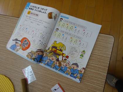 リズムを組み合わせて,くりかえし(反復)を使った「おまつりのリズム」をつくりました。
