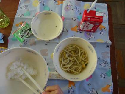 今日の給食はカレーうどんでした。普段と違い,ご飯ではなく「カレーうどん」を大食器に盛り付けました。