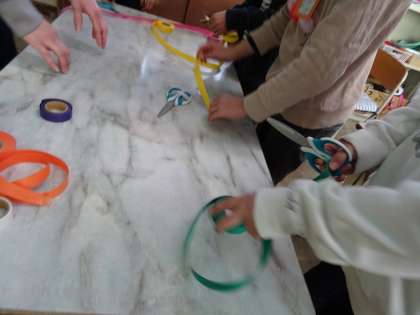 1mの長さをテープなどでつくったり身の回りから見付けたりして,1mの量感を身に付けました。