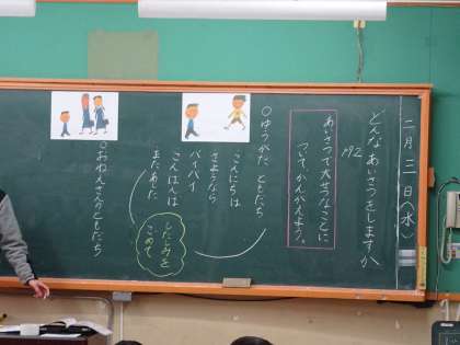 教材「どんなあいさつをしますか」を使って話し合いました。