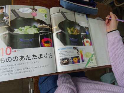 中華鍋で料理をする様子の写真から,金属の中華鍋が温まる様子について気付いたことを話し合いました。