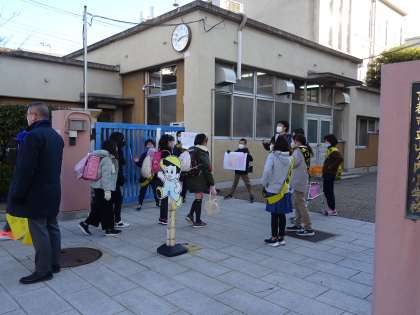 代表委員会の活動です。あいさつができる学校を目指して,代表委員会の児童があいさつ運動をしています。