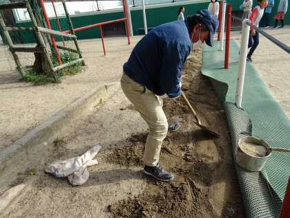 鉄棒での怪我防止のために,地面に衝撃吸収マットを設置しました。