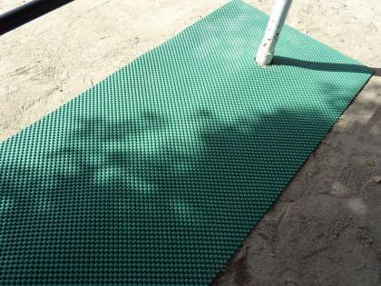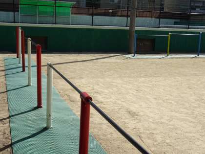 マットの設置が終わりました。鉄棒の支柱にも,安全クッションをつける予定です。