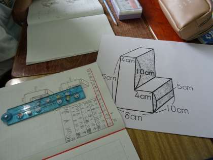 L字型などの複合立体図形を分割したり,補完したりして,その体積を直方体の求積公式を使って求めました。