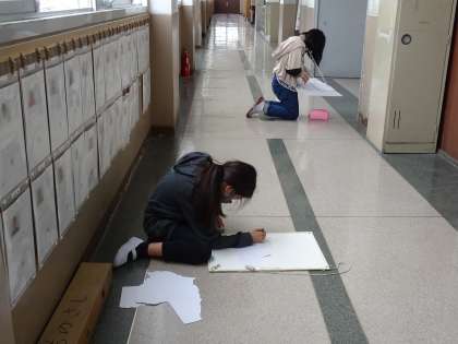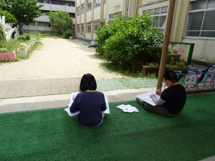 大きな紙をちぎって,スケッチをしています。
