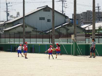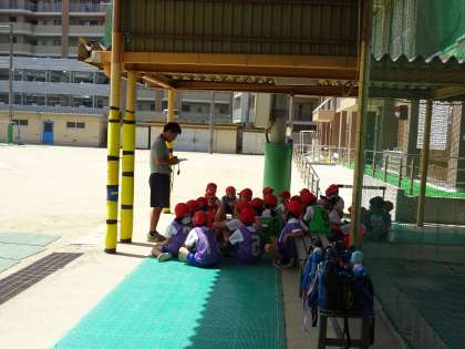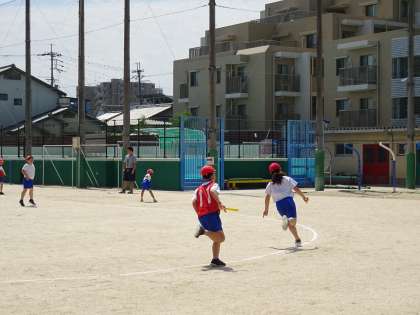 リレーの仕方に慣れ,確実にバトンパスをして相手チームと競走することを楽しんでいます。