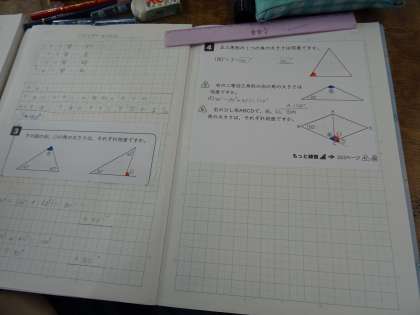 三角形の3つの角の大きさの和を使って,角の大きさを求めました。