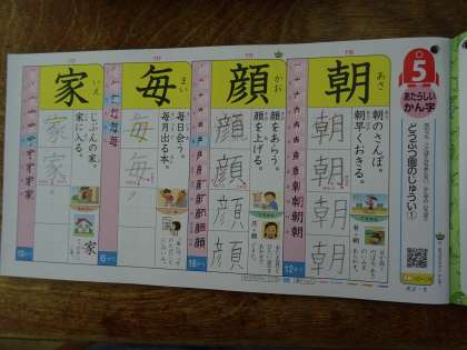 「朝」「顔」「毎」「家」の漢字を学習しました。