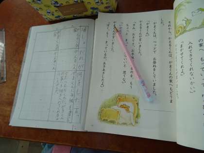 挿絵を見ながら誰が何をしたところなのか考えました。