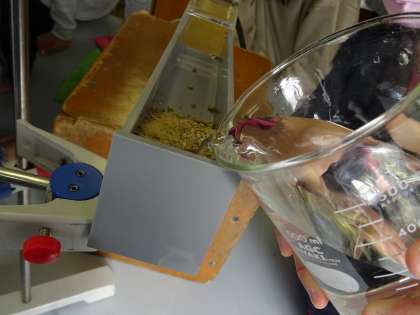大きな砂は下に,細かい泥は上に積もって層ができることが分かりました。