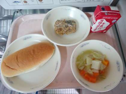 3 水300ccとコンソメの素でスープを作り,ローリエを加えて,人参・玉ねぎ・じゃがいもを煮て,さらに,キャベツを加えて弱火で煮込む。