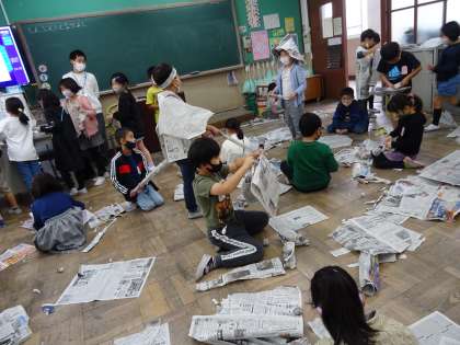新聞紙がもつ特徴や質感を体全体で感じながら,楽しく活動をしました。