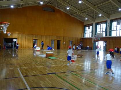 教師が示した跳び箱を使った遊びに挑戦しています。