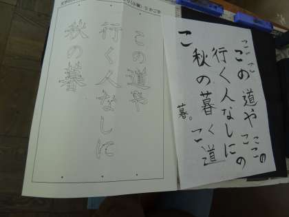 ♪6年生 書写「文字の大きさと配列,点画のつながり(小筆)」〜この道や行く人なしに秋の暮〜 その1