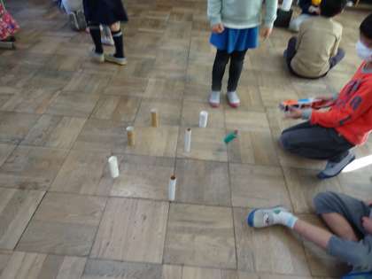 集めた物の特徴を活かして,積んだり,転がしたり,はじいたりしながら遊びました。