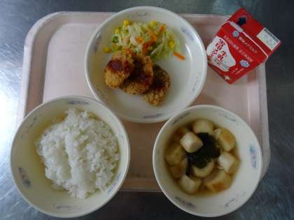 今日の給食は,給食室で一枚ずつ衣をつけた手作りの「ヒレカツ」です。ヒレカツにかけるソースも手作りです。サクサクの衣に甘辛いソースをかけて味わって食べました。