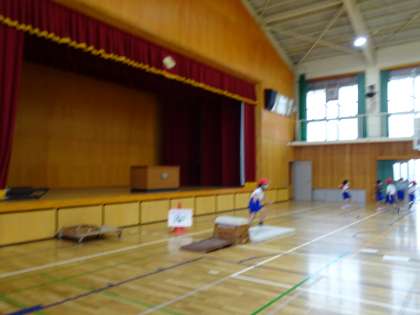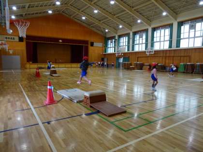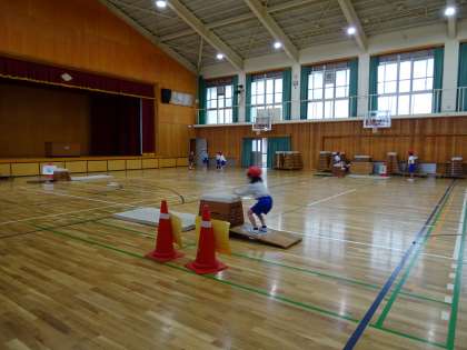 教師が示した跳び箱を使った遊びに挑戦しています。