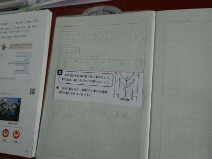 対称の軸で折ったときに重なる点,線,角について調べました。