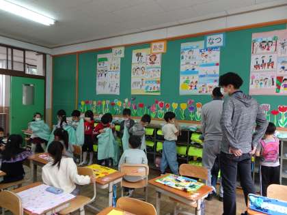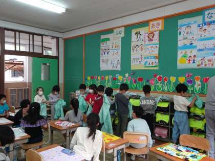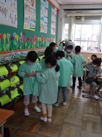 1年生にとって,小学校入学後初めての給食当番です。上下左右や裏表に注意してエプロンを身につけました。