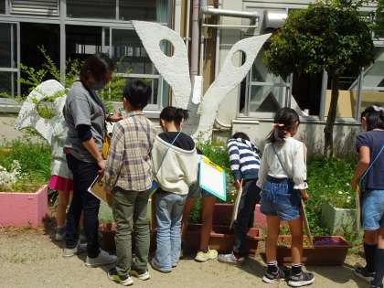 校庭や学校の周りで植物や動物などの生き物を見つけました。