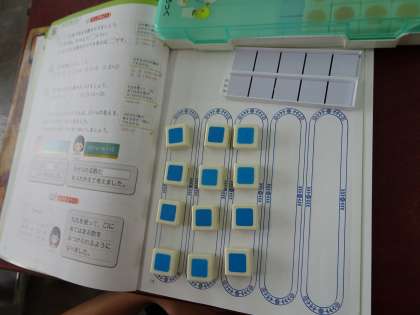 数図ブロックを使って,一人分は何個になるかを調べました。