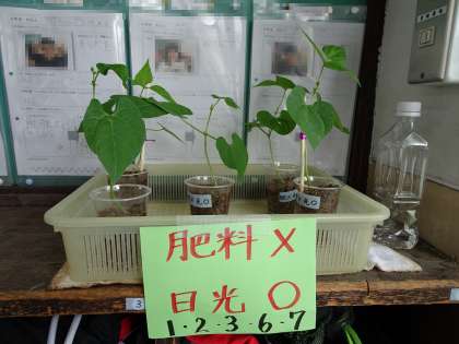 植物の成長に日光や肥料が必要かどうか,条件を整えて調べています。