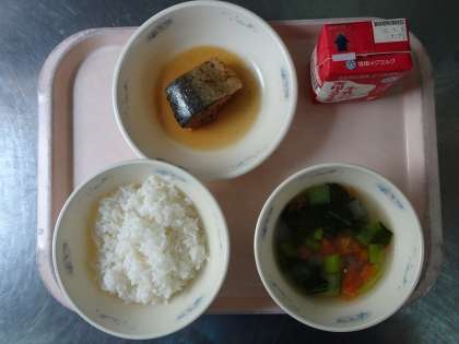 給食では,手作りのだんごにも汁にもトマトを使っています,