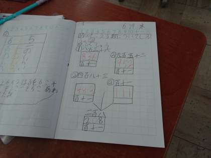 100をこえる数の表し方や仕組みに関心をもち,10や100のまとまりに着目して,100をこえる数の数え方やよみ方を考えました。