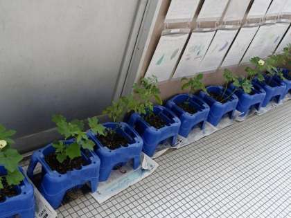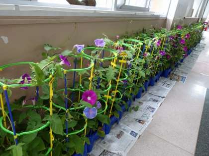 強風に備えて、アサガオを校舎内に避難させました。