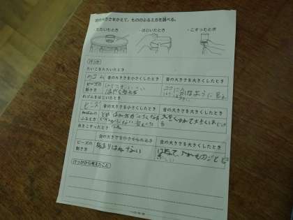 音の大きさを変えたときの物の震え方の違いを比べながら調べました。
