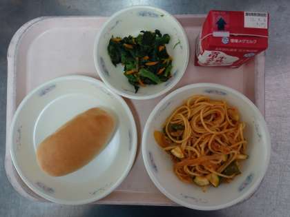 ハムや玉ねぎ、夏に美味しいピーマンとズッキーニを使ったトマト味のスパゲティです。