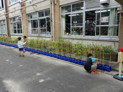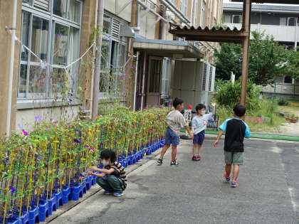 毎朝、1年生がアサガオの世話をしています。きれいな花を咲かせています。