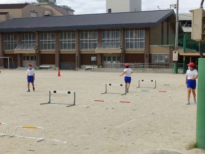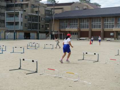 3台の小型ハードルを一定のリズムで走り越す工夫をして、同じくらいの走力の相手と競走して楽しみました。
