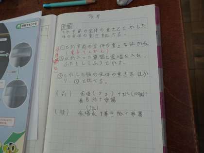水にものを溶かした後の水溶液の重さは,どうなるのか予想しました。