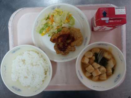 給食室で一枚ずつ衣をつけて、油で揚げた手作りの「ヒレカツ」です。