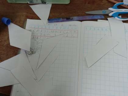三角形の紙を頂点や辺から切ることによって,三角形や四角形に分けられることに気付きました。