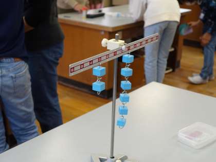 実験用てこのうでが水平になってつり合うときは,どのようなきまりがあるのか,結果を基に話し合いました。