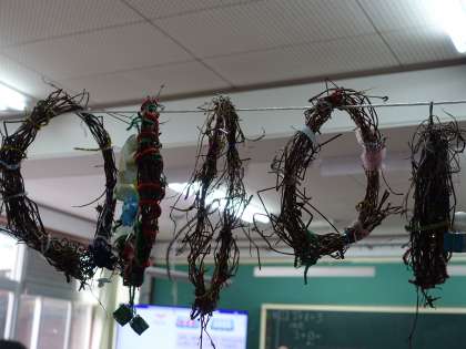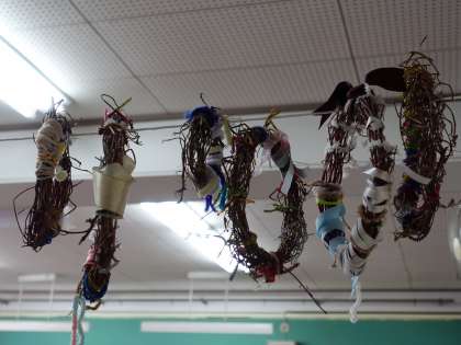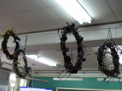 生活科の学習でつくったリースを掲示しています。