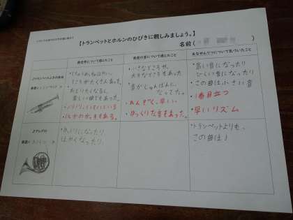 「トランペットふきの休日」と「アレグロ」を聴き,トランペットとホルンの音色の違いに気を付けて聴きました。