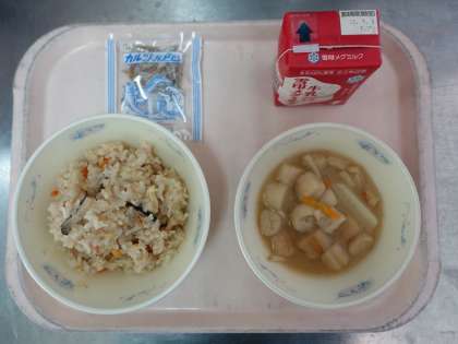 今日の「炊きこみ五目ごはん」は、学校で保管していた缶詰や乾燥させた食べ物を使い、自校の釜で調理しています。いろいろな食べ物が入っています。