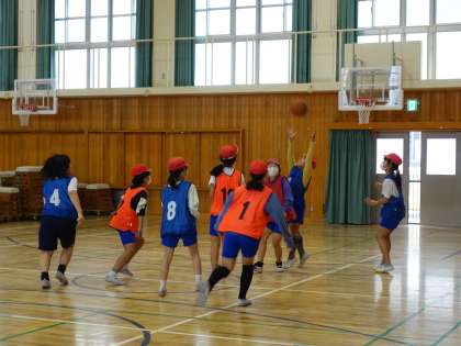 シュートにつながるようなすばやくタイミングのよい動きや作戦を工夫しながら,相手チームに挑戦して楽しんでいます。
