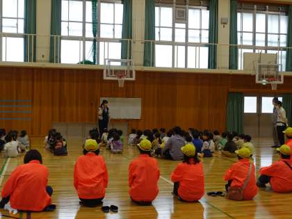 京都府右京警察署交通課の皆様にお越しいただき、1年生対象の交通安全教室を行いました。