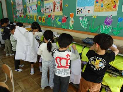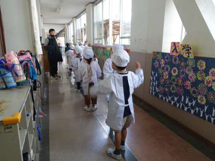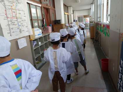 1年生にとって初めての給食です。給食当番の児童は少し緊張気味でした。