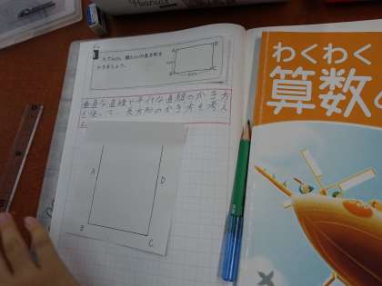 垂直や平行の直線のかき方を使って長方形のかき方を考えました。