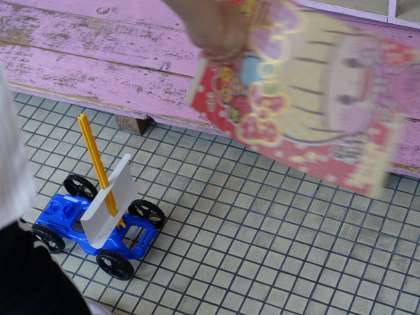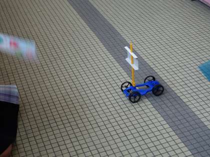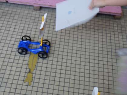 風で動く車を作り、うちわであおいで遊んでみて、気付いたことを話し合いました。