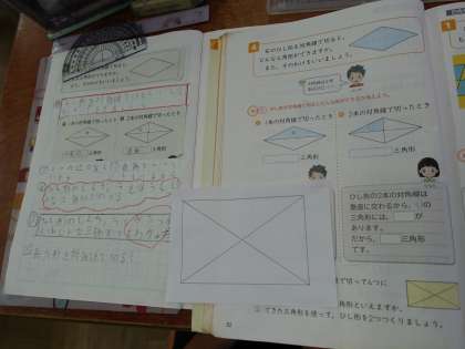 ひし形を2本の対角線で切ったときには、直角があるから直角三角形ができることが分かりました。