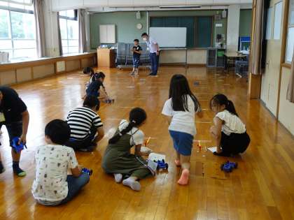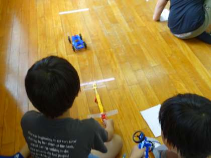 輪ゴムの伸ばし方を変えた時の車の進む距離の変わり方を比べながら調べました。
