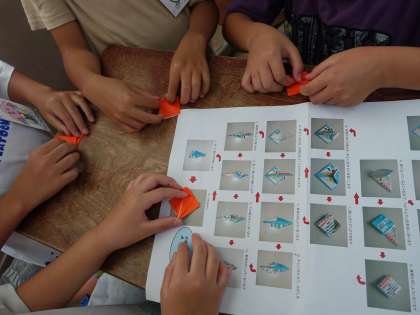 6年生は下級生に折り紙を教えました。