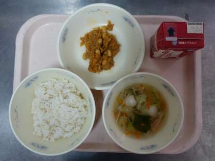 「ドライカレー」とは、汁気のないカレーのことです。給食では、大豆・まぐろフレーク・玉ねぎ・にんじんを使い、作りました。美味しくなるように、大豆のゆで汁も使いました。